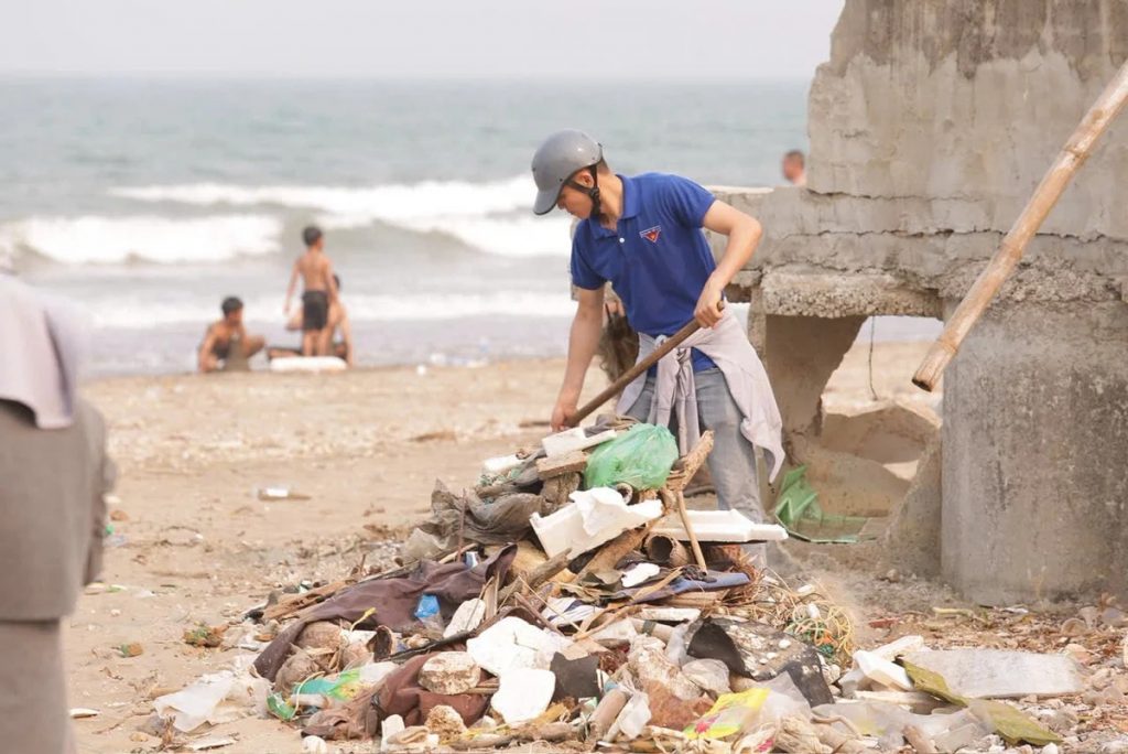 Đoàn viên thanh niên tích cực thu gom, xử lý rác thải tại bãi biển Quỳnh Nghĩa. Ảnh: Hữu Tình.